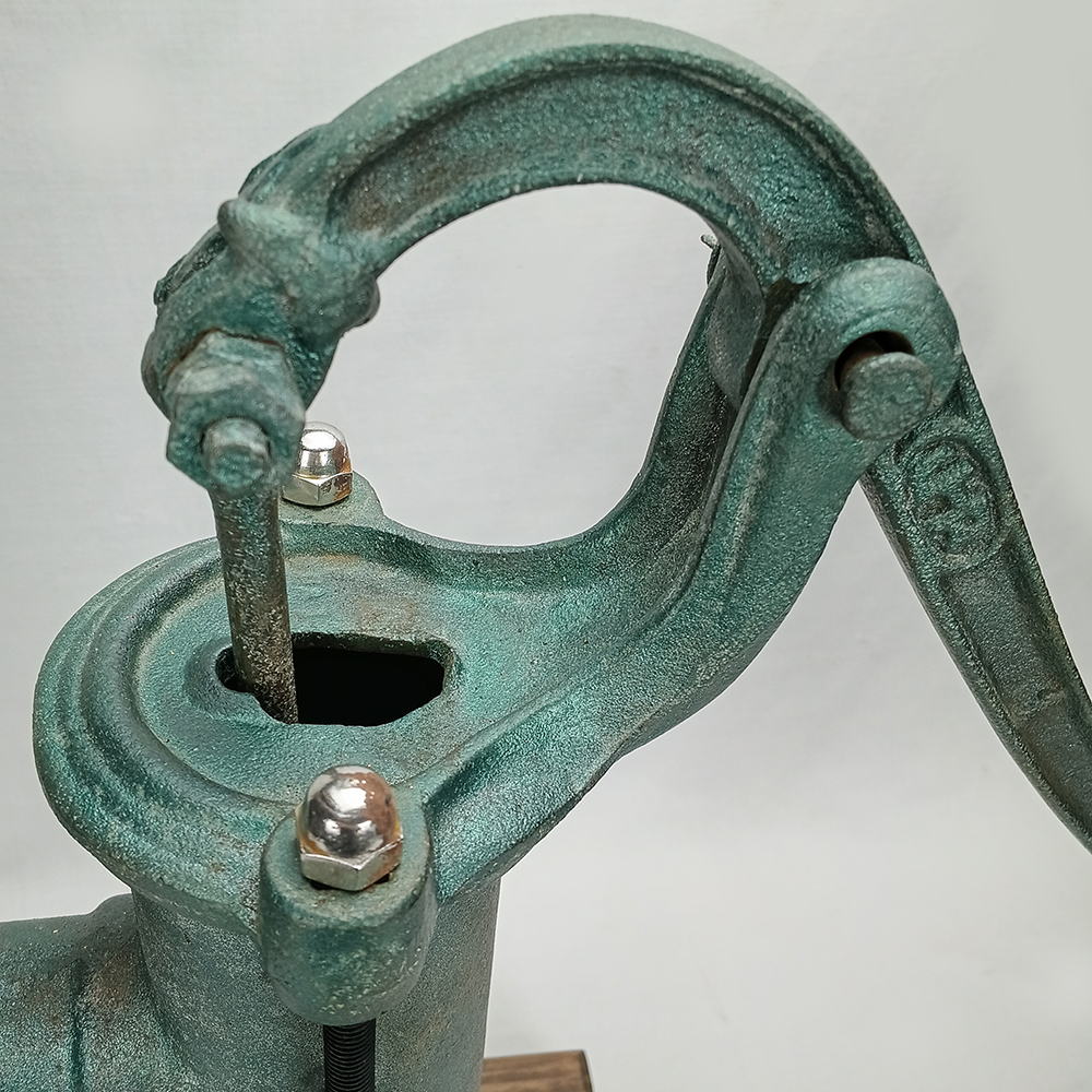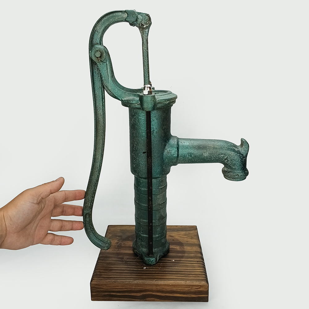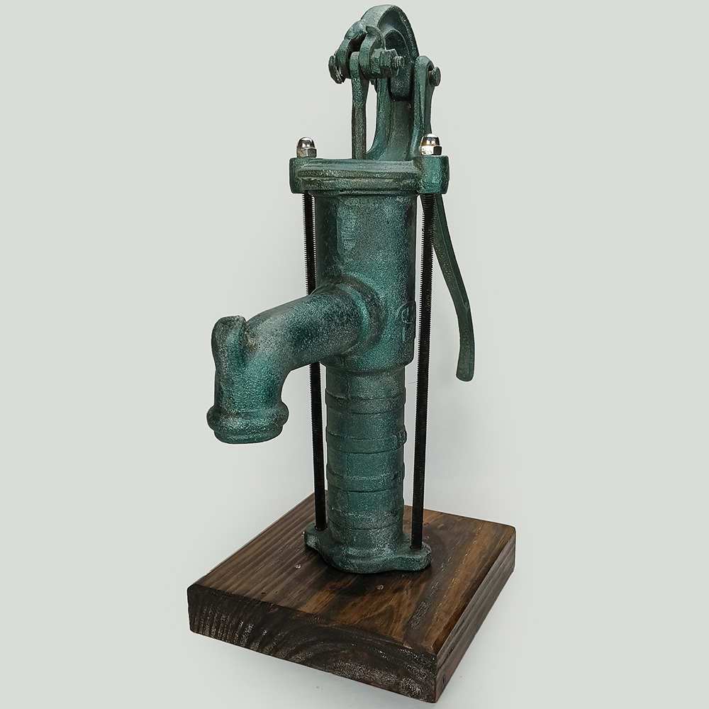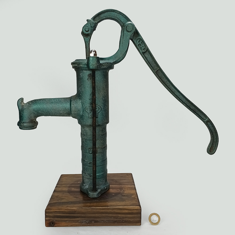 DI 21 – Bomba de água de poço antiga em ferro fundido com pintura verde e base em madeira