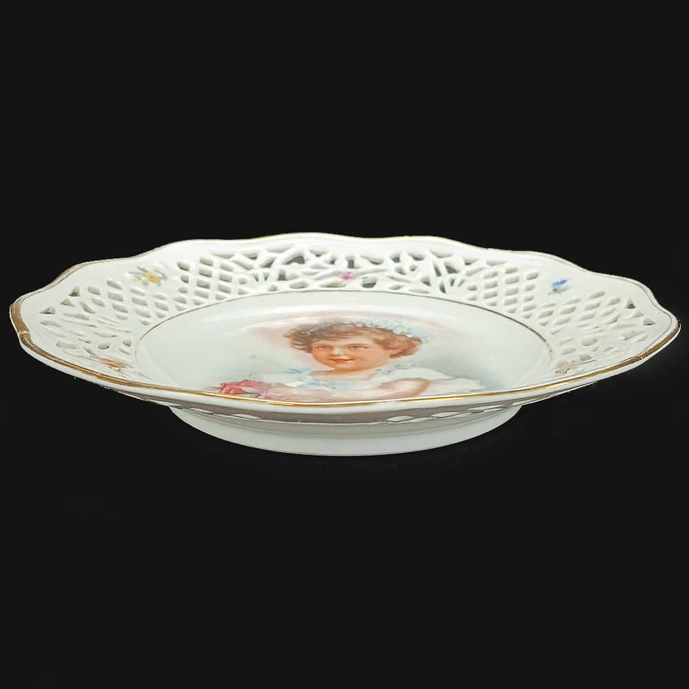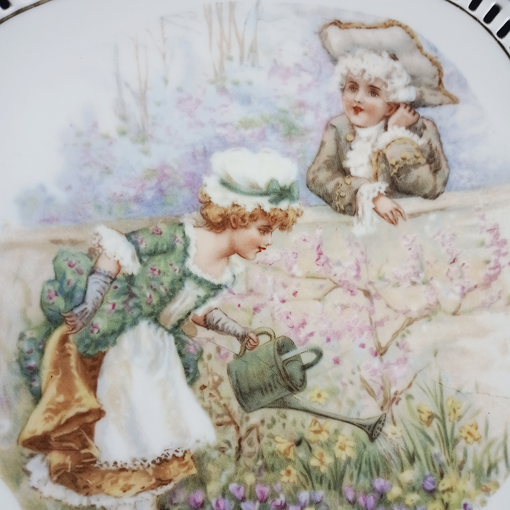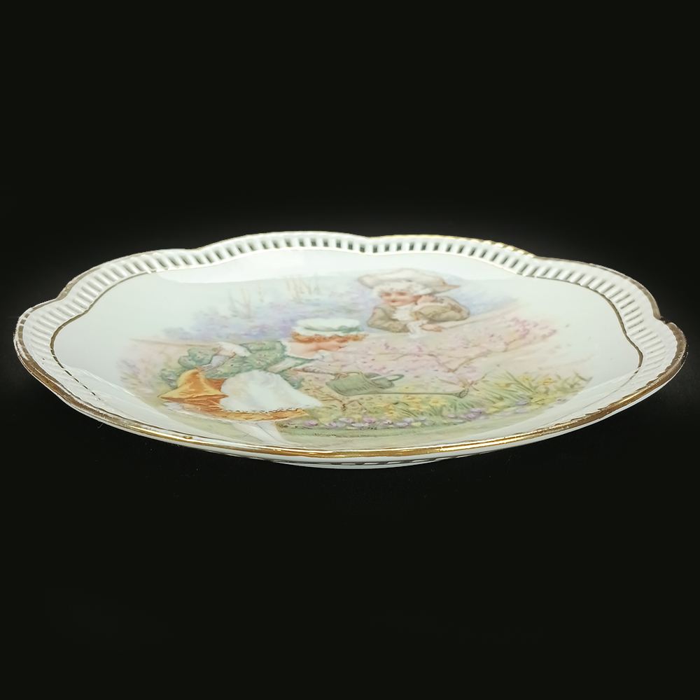 LO 88 – Prato antigo em porcelana alemã Schumann Bavária crianças em um jardim – borda rendada/vazada