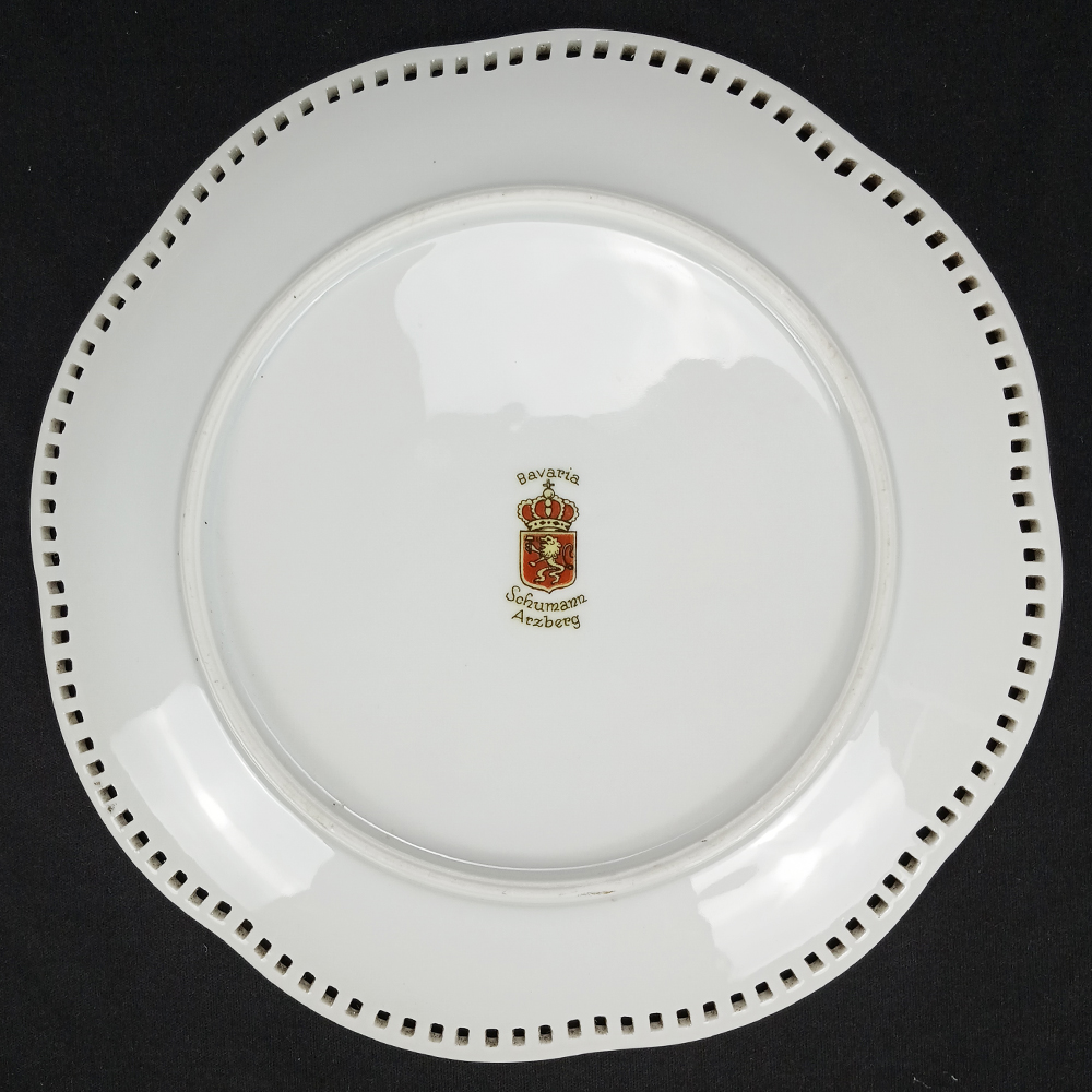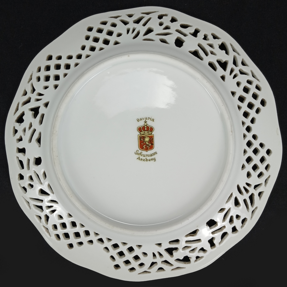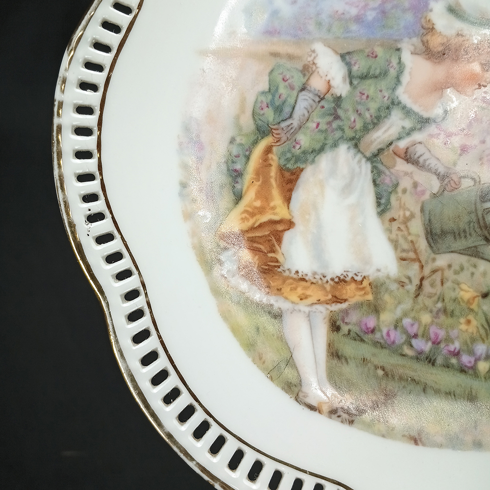 Antigo e belo prato em porcelana alemã Schumann, da região da Bavária. É decorado com cena de menino e menina em um jardim de flores, e a borda possui delicado trabalho rendado/vazado/fenestrado. De meados do século passado, está em ótimo estado de conservação, ideal para decoração, coleção ou para presentear.