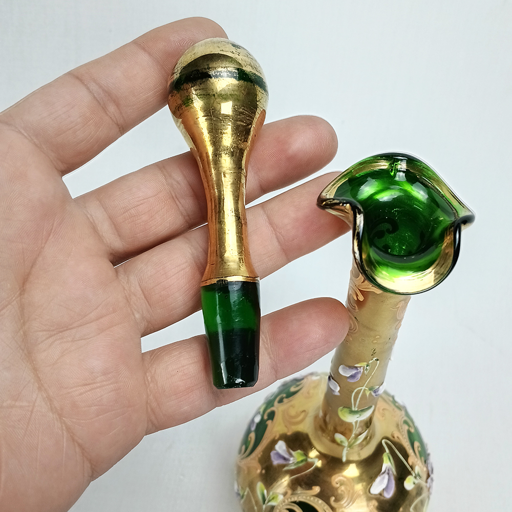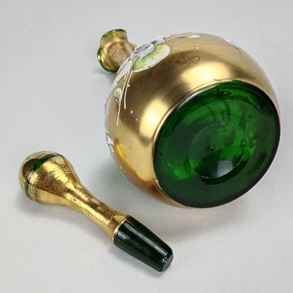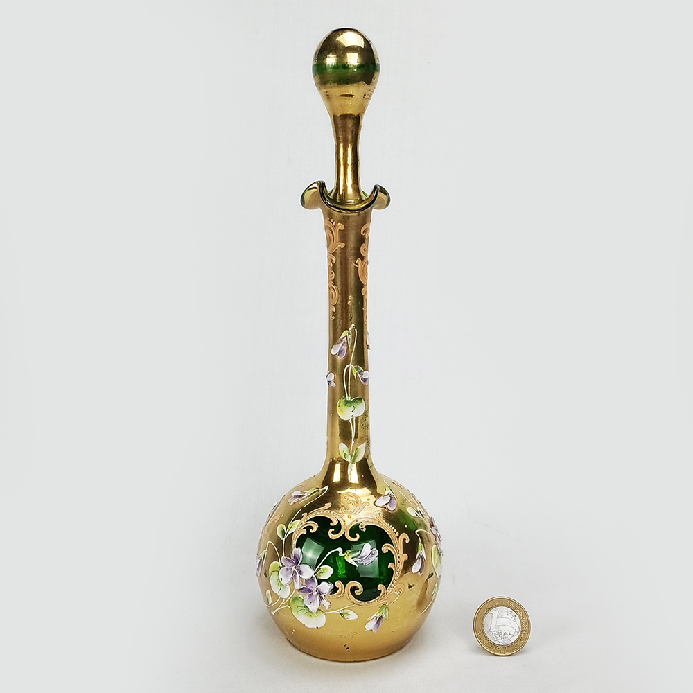 Belíssima garrafa antiga de licor, feita de vidro verde veneziano ou da Boêmia. É ricamente decorada com flores em estilo Art Nouveau pintadas à mão em esmalte, além de grande pintura em ouro (com discreto desgaste). Do início do século passado, está em ótimo estado de conservação, ideal para decoração ou para colecionadores.