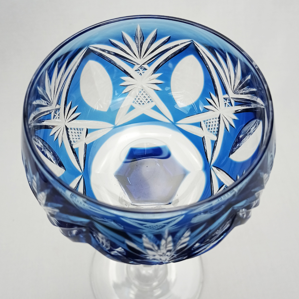 Belíssima taça para vinho em cristal azul de ótima qualidade e sonoridade. É ricamente lapidada no bojo, e a haste é facetada. De meados do século passado, está em ótimo estado de conservação, ideal para uso e decoração. Temos 6 unidades.