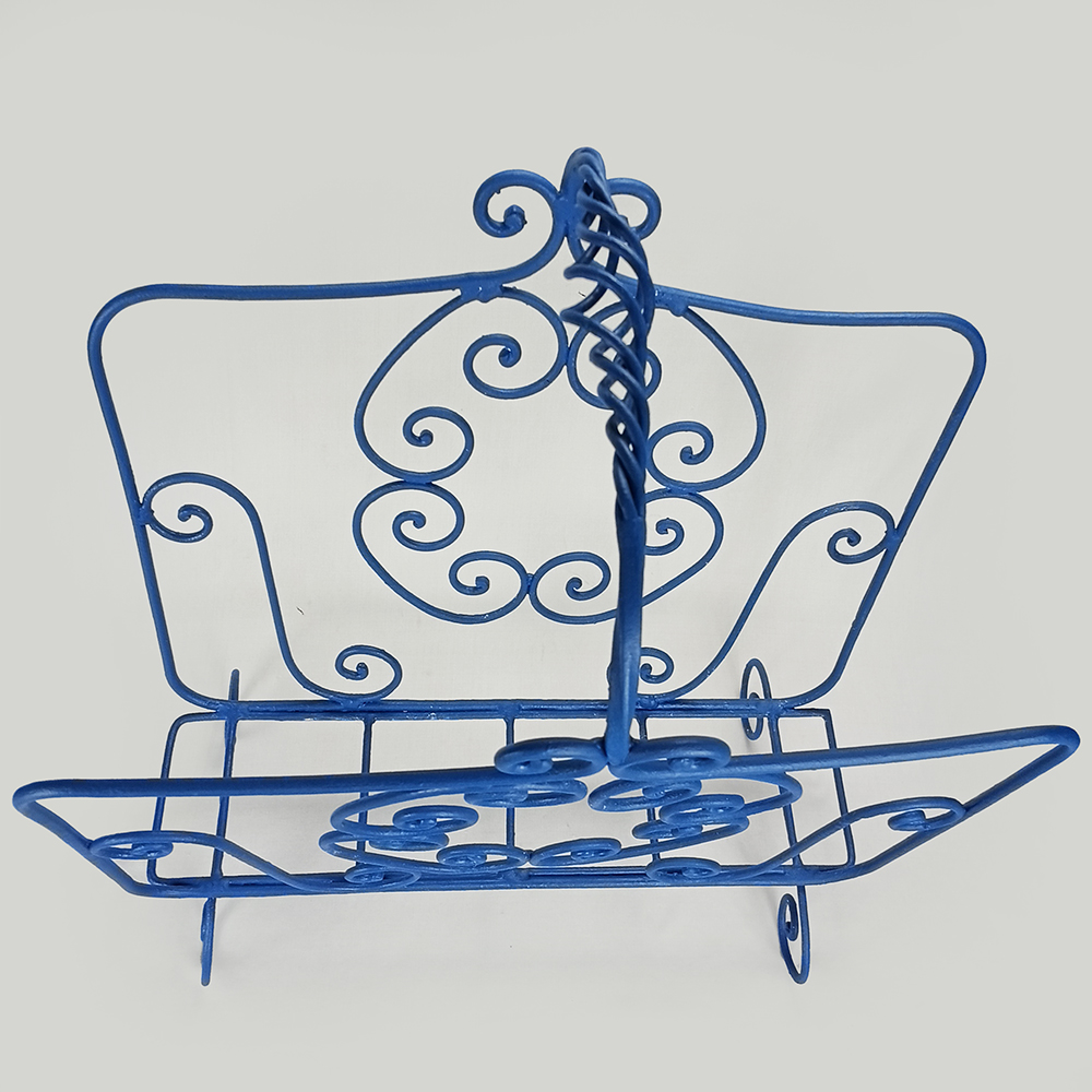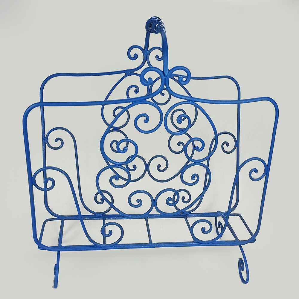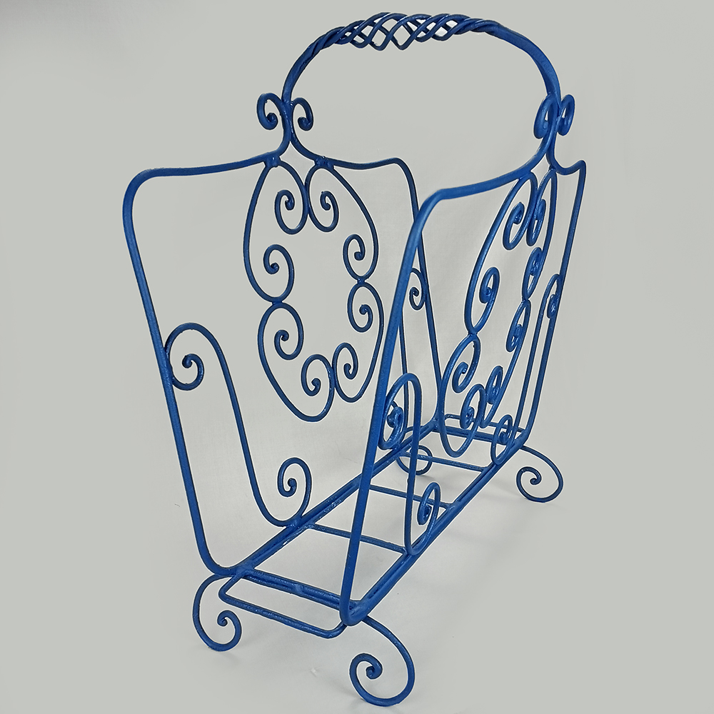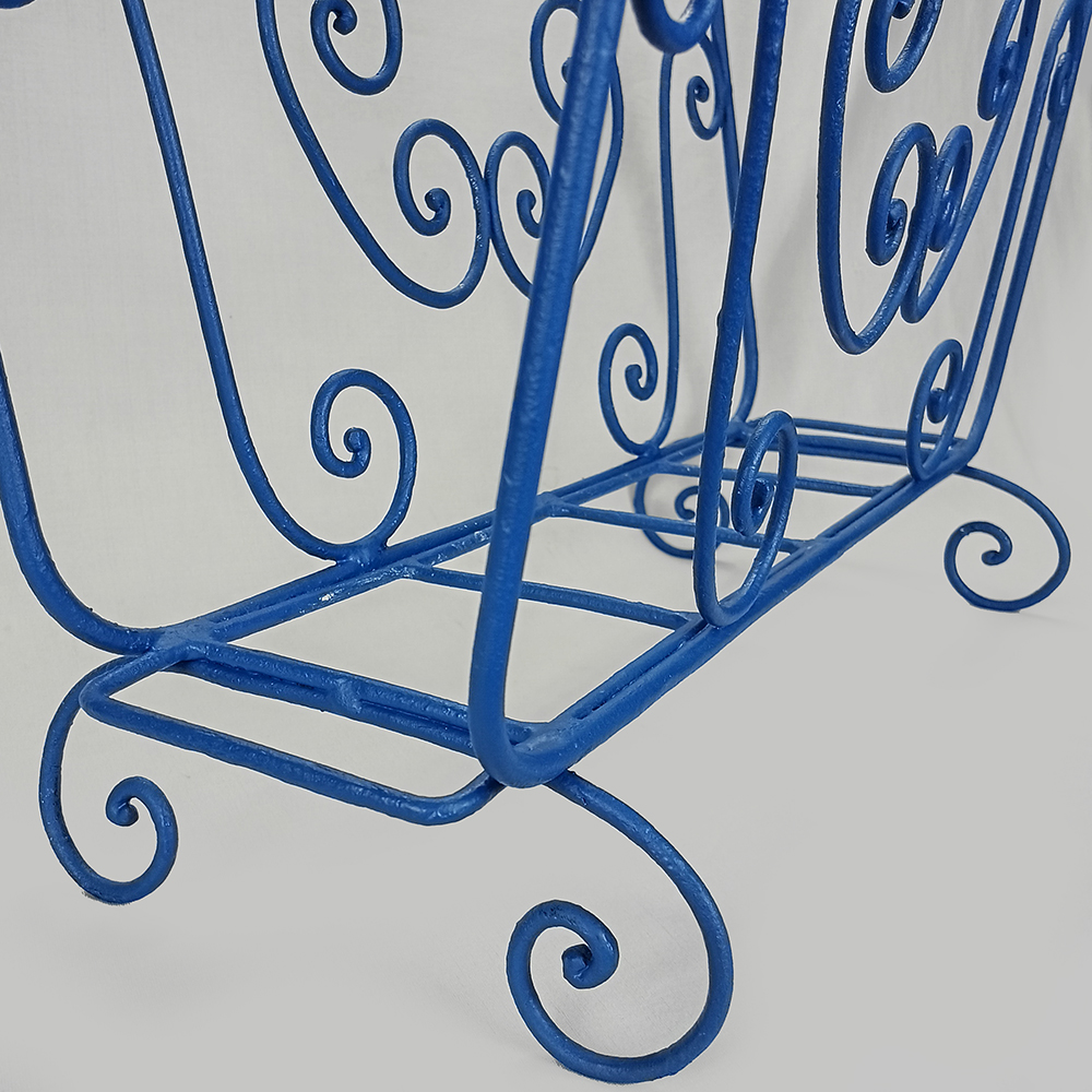 Belo revisteiro ou porta revistas, feito de ferro com pintura em azul. É ricamente decorado com arabescos em toda a peça. Está em ótimo estado de conservação, ideal para uso e decoração. A revista que aparece na primeira foto é apenas ilustrativa.