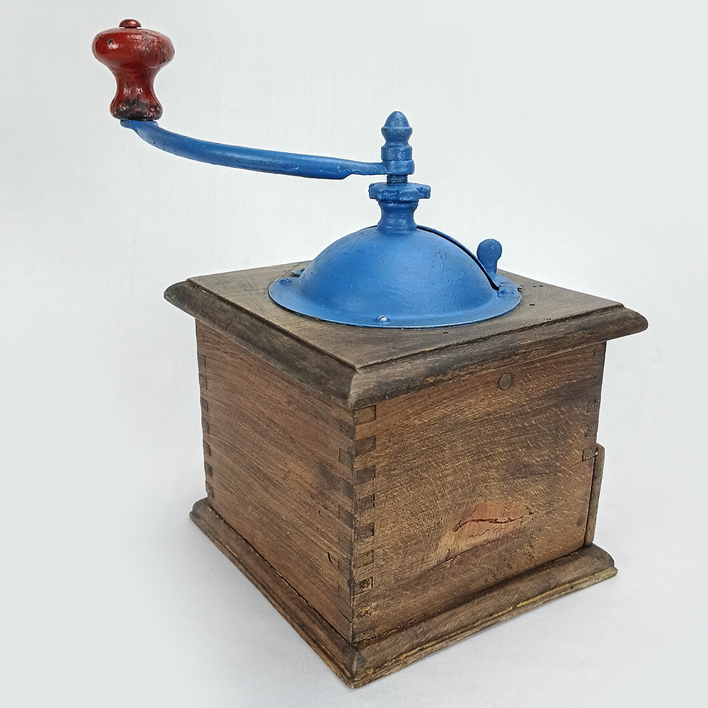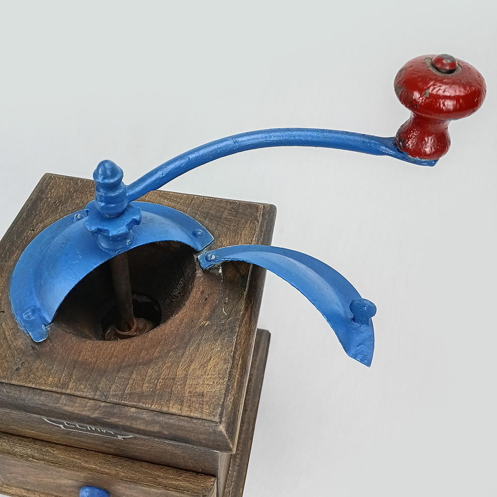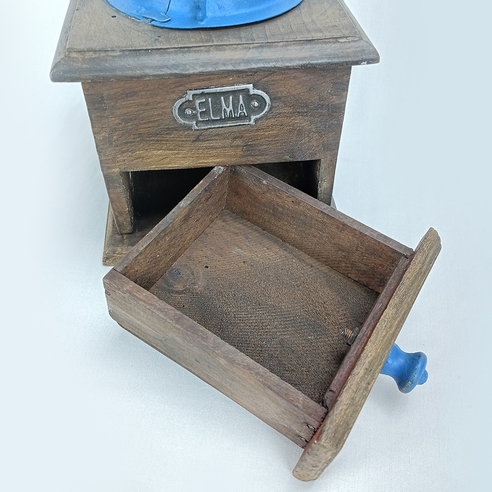Antigo e belo moedor Elma, para café e outros grãos. Possui caixa em madeira com malhete ou rabo de andorinha nos encaixes, característica encontrada somente nas peças de qualidade superior. Manivela e mecanismo em ferro fundido. Da primeira metade do século passado, está em bom estado de conservação, apresentando algumas marcas do tempo e de uso, mas que só adicionam rusticidade à peça. Funcionamento aparente, sem garantias. Ideal para decoração.