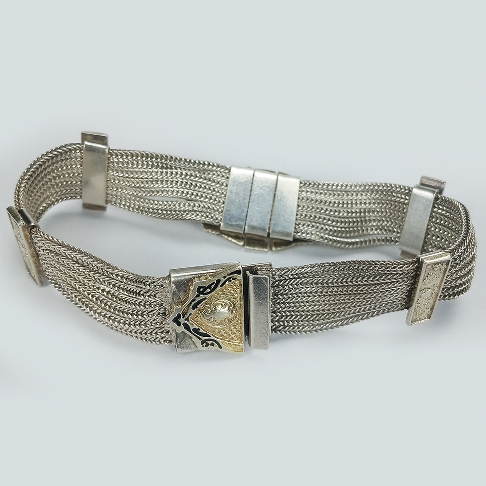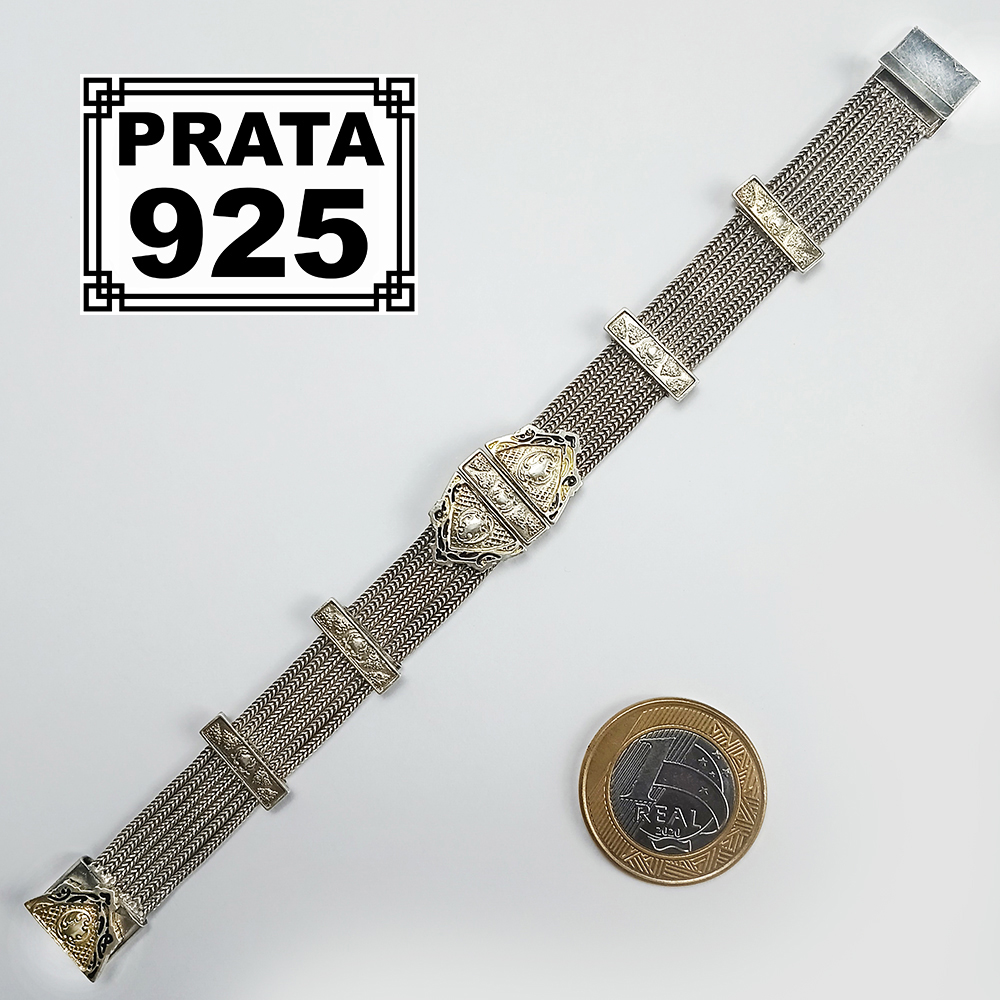 Bela pulseira antiga em prata de lei de teor 925. É formada por 7 correntes que passam por elos que as unem. Possui medalhão central com resquícios de esmaltação. Está em ótimo estado de conservação, ideal para uso.