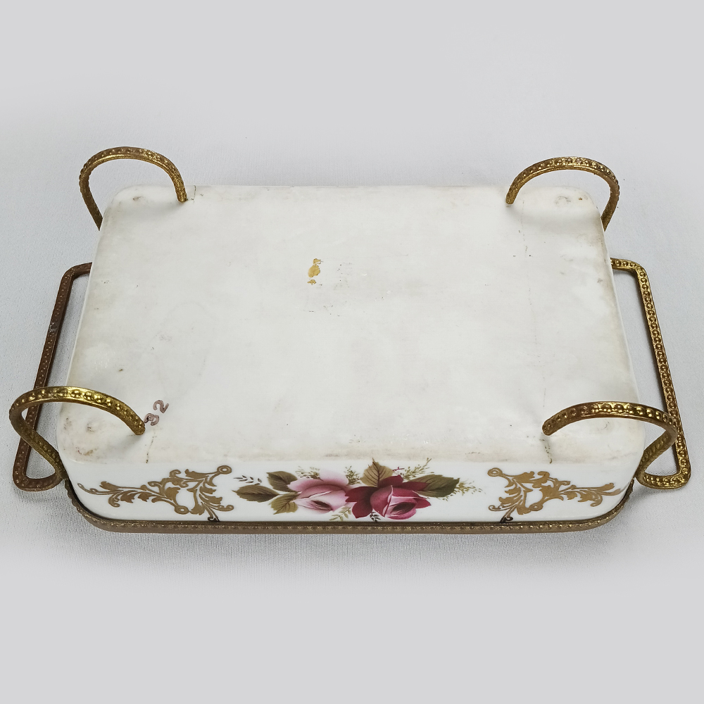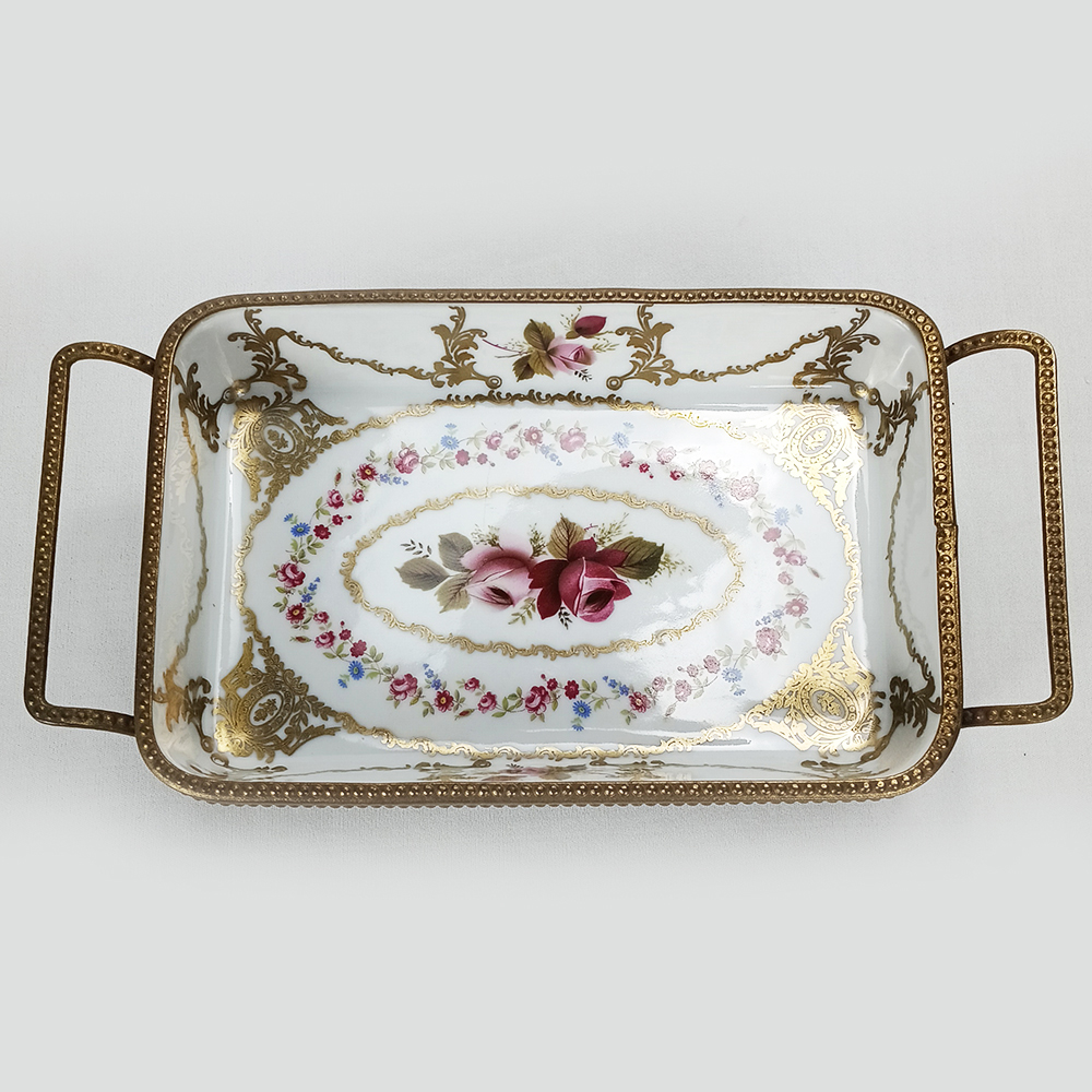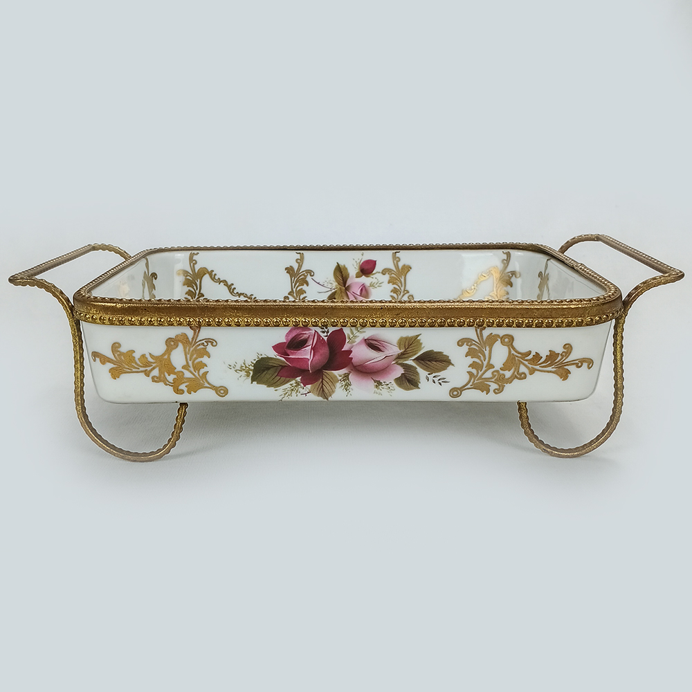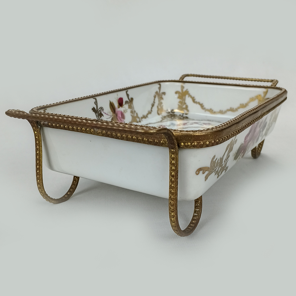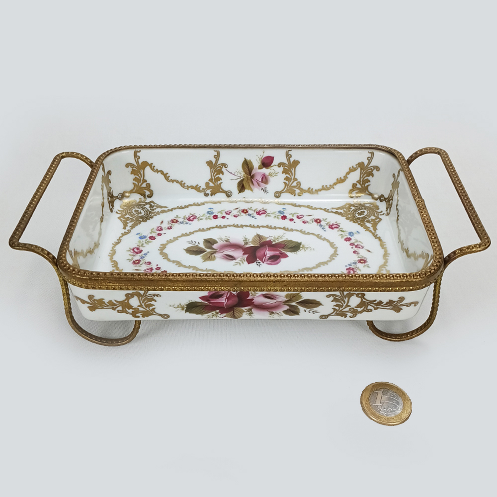 Belo centro de mesa antigo com formato retangular, feito de porcelana, É ricamente decorado com flores coloridas e pintura em ouro. Possui borda, alças e pés em bronze. Não possui marca de fabricação. De meados do século passado, está em ótimo estado de conservação, ideal para decoração.