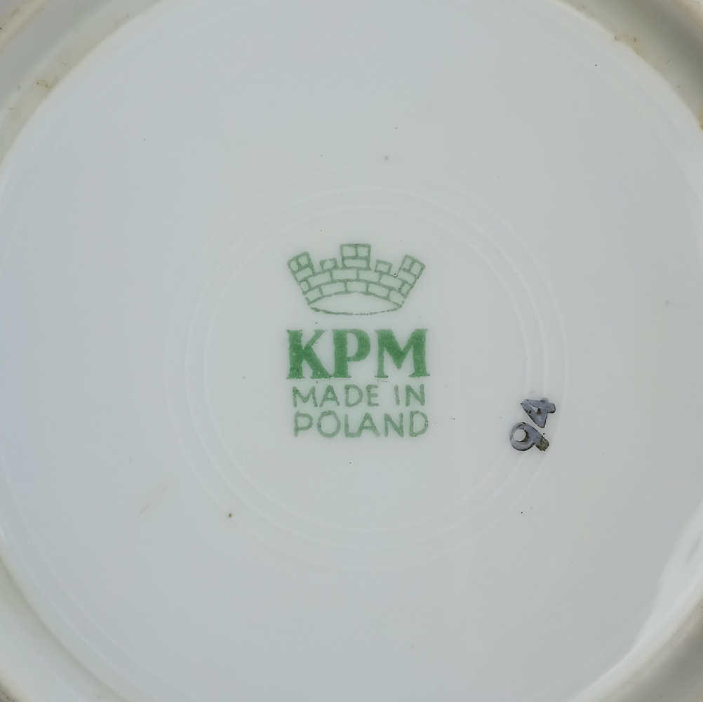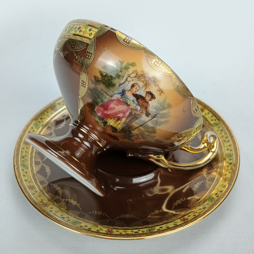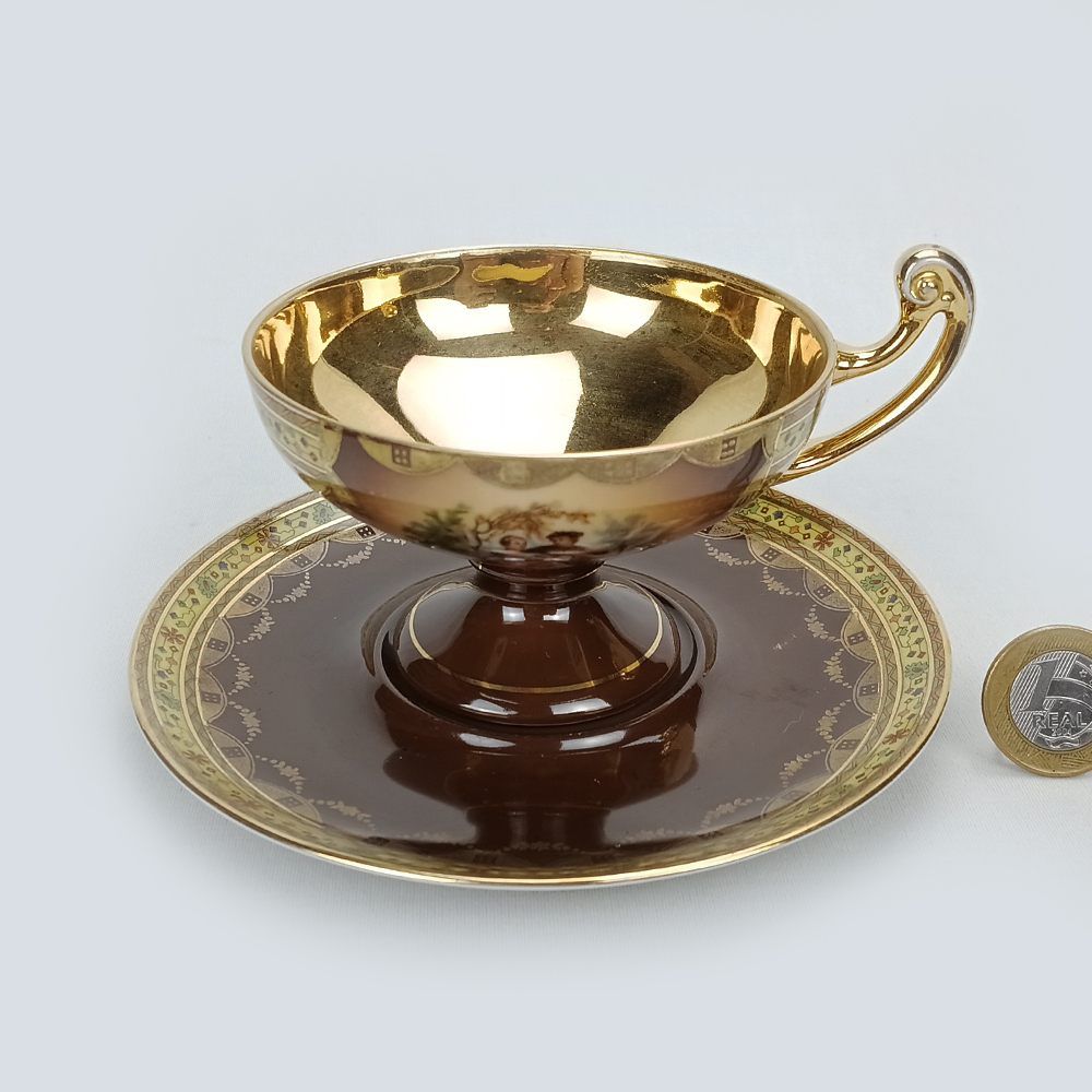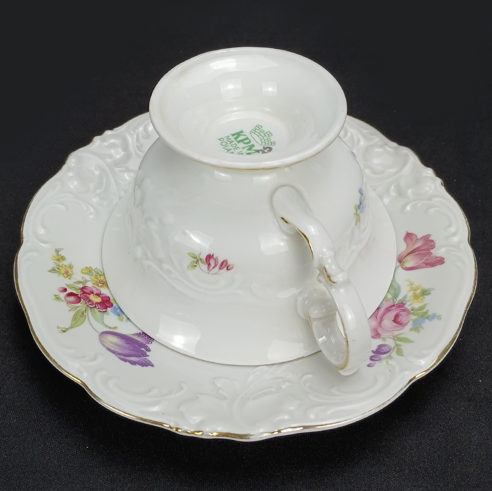 Bela xícara de café ou chá em porcelana KPM, de origem polonesa. É decorada com clores coloridas e detalhes em relevo, além de frisos em ouro. De meados do século passado, está em ótimo estado de conservação, ideal para uso, decoração, coleção ou para presentear. Temos 2 unidades.