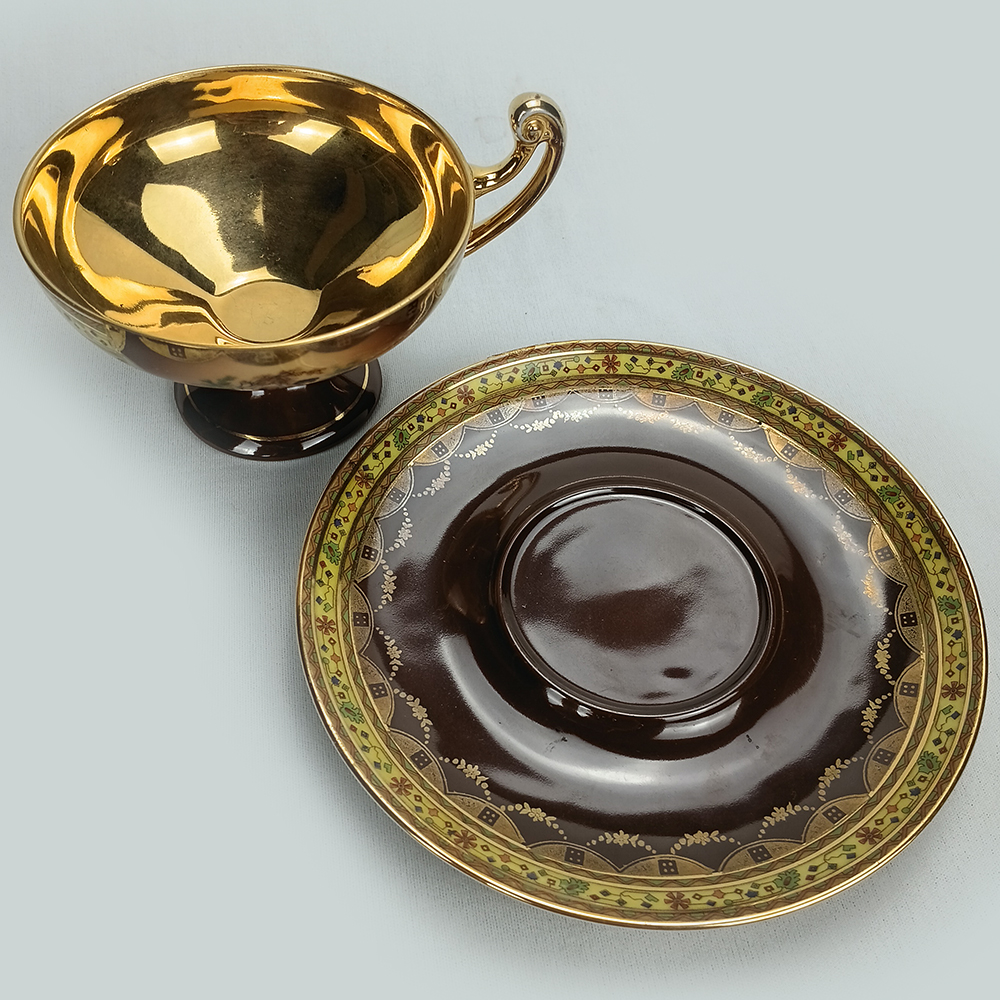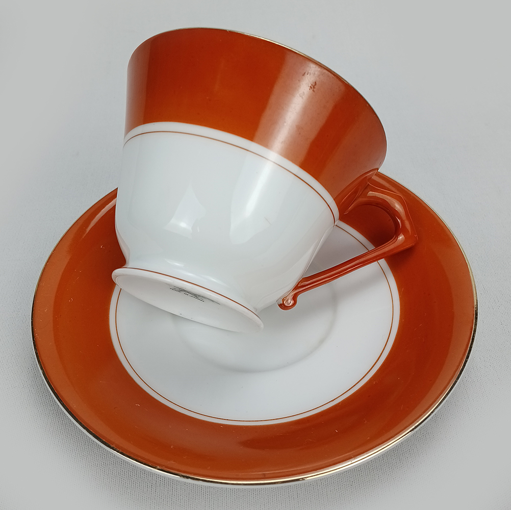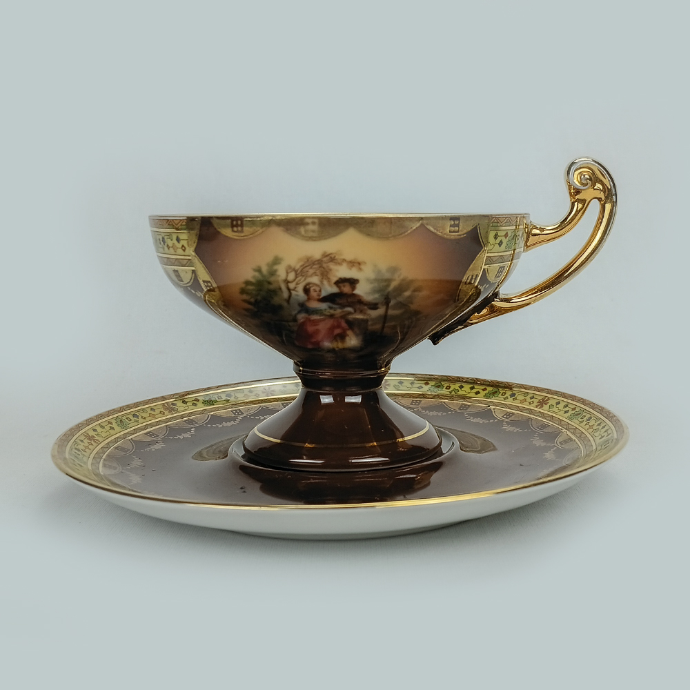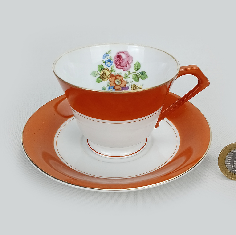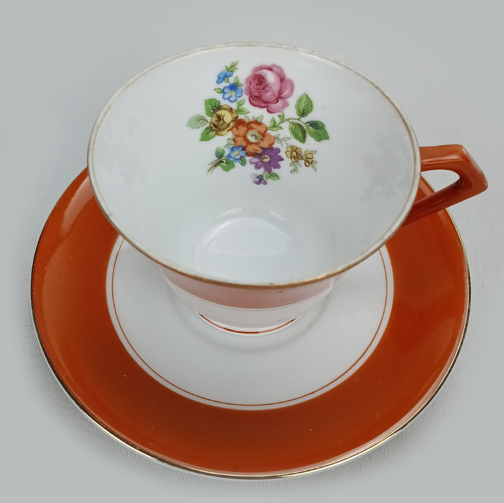 Bela xícara de café ou chá em porcelana KPM, de origem polonesa. É decorada com clores coloridas e detalhes em relevo, além de frisos em ouro. De meados do século passado, está em ótimo estado de conservação, ideal para uso, decoração, coleção ou para presentear. Temos 2 unidades.
