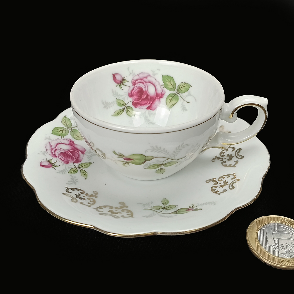 LO 165 – Xícara de cafezinho antiga em porcelana Renner com rosas e dourados
