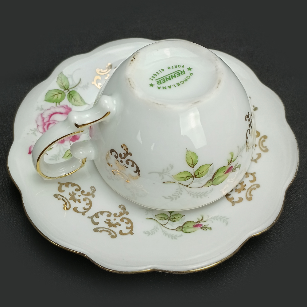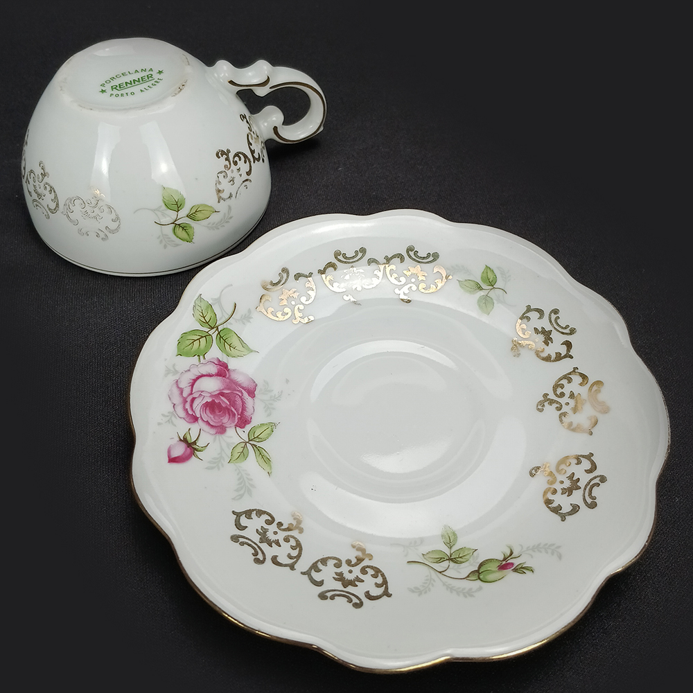 Xícara de cafezinho antiga em porcelana brasileira Renner. É decorada com flores de roseira e dourados. De meados do século passado, está em ótimo estado de conservação, ideal para uso, decoração ou coleção.