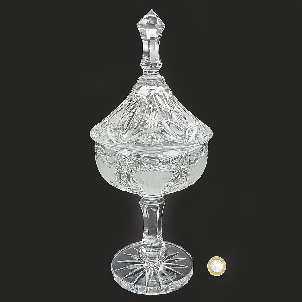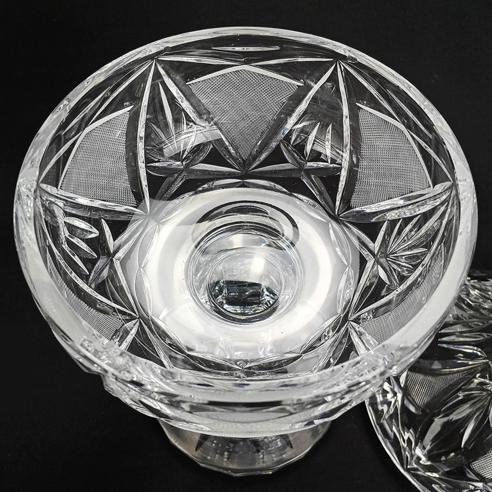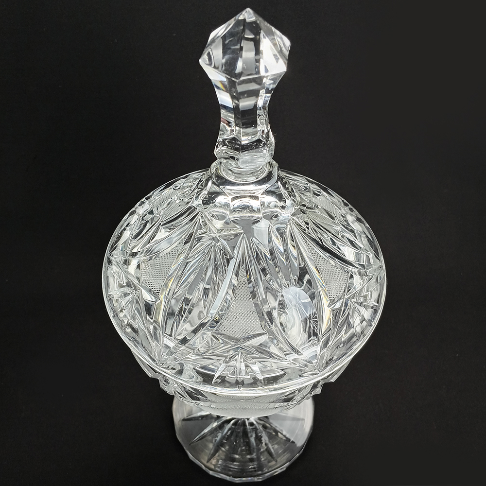 Grande compoteira vintage em cristal transparente prensado e detalhes lapidados.