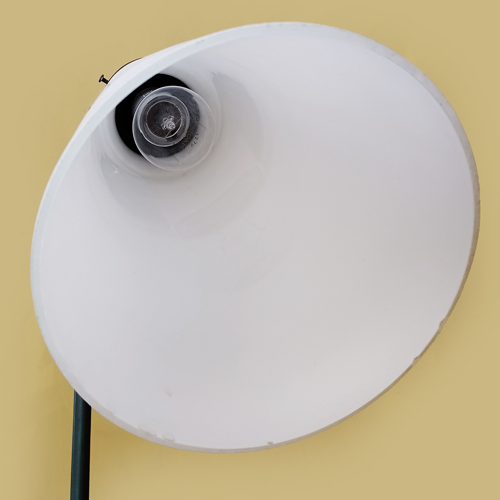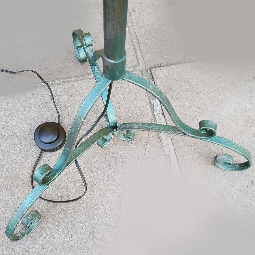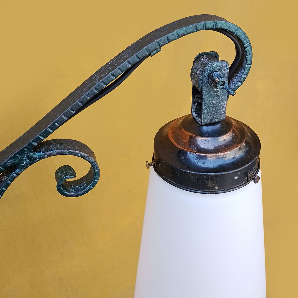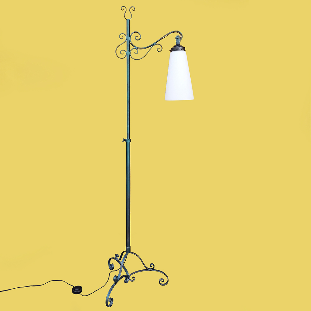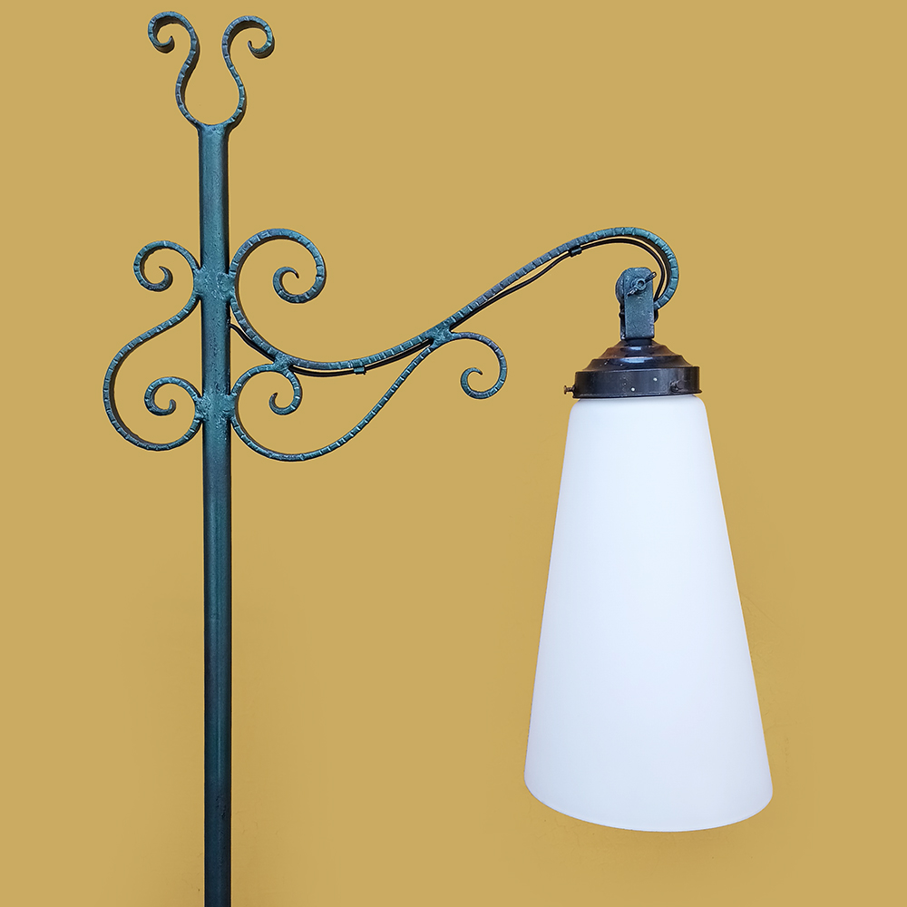 LU 26 – Luminária de chão antiga em ferro com arabescos e grande tulipa em vidro branco