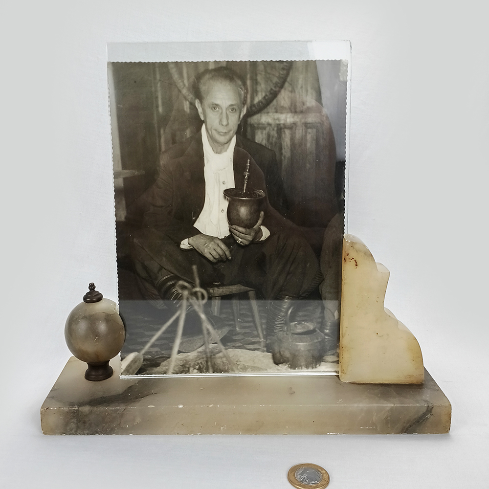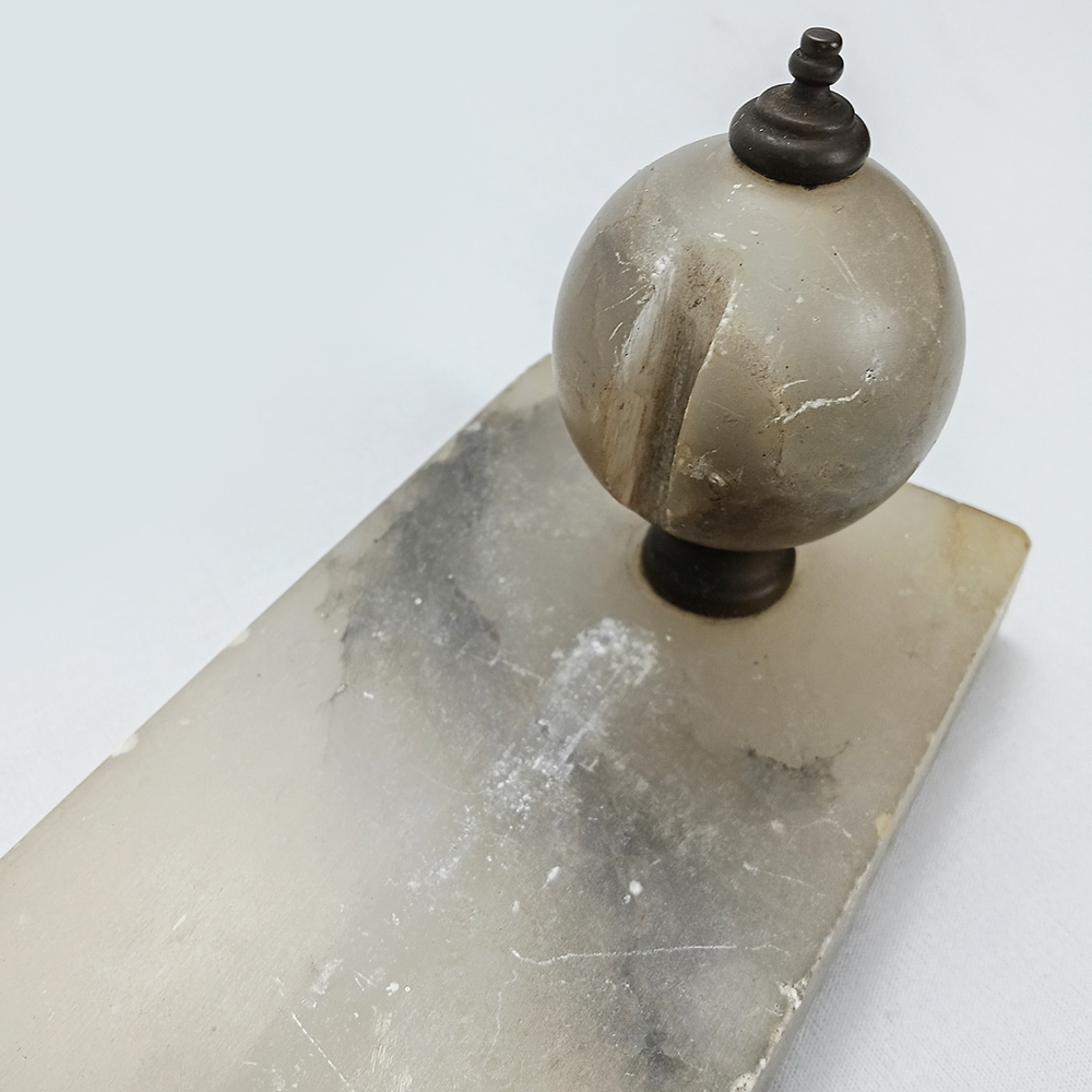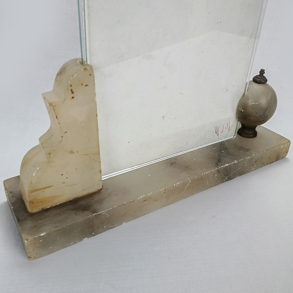 Fruteira com base em bronze ricamente trabalhado e prato em vidro azul turquesa. Peça antiga, bem conservada.