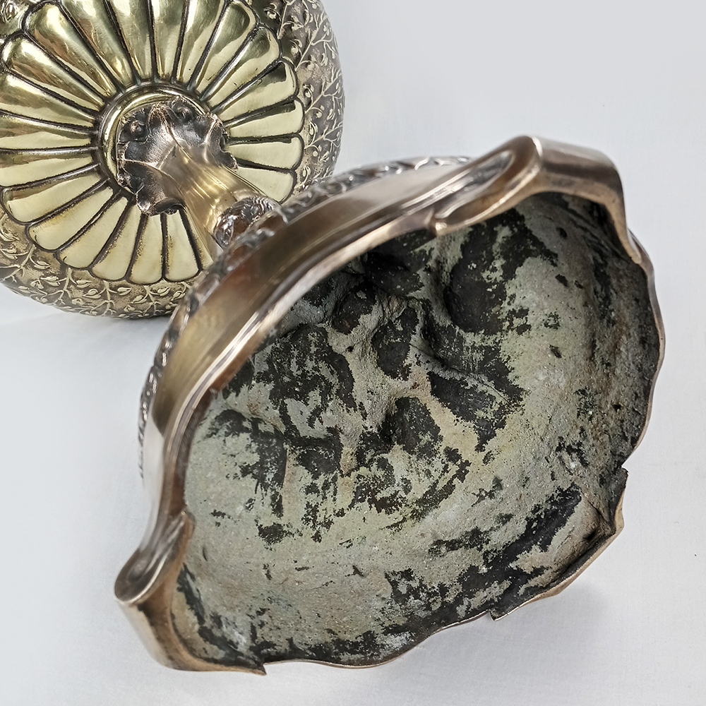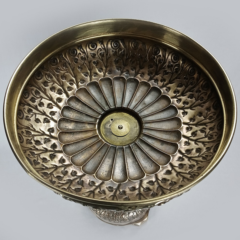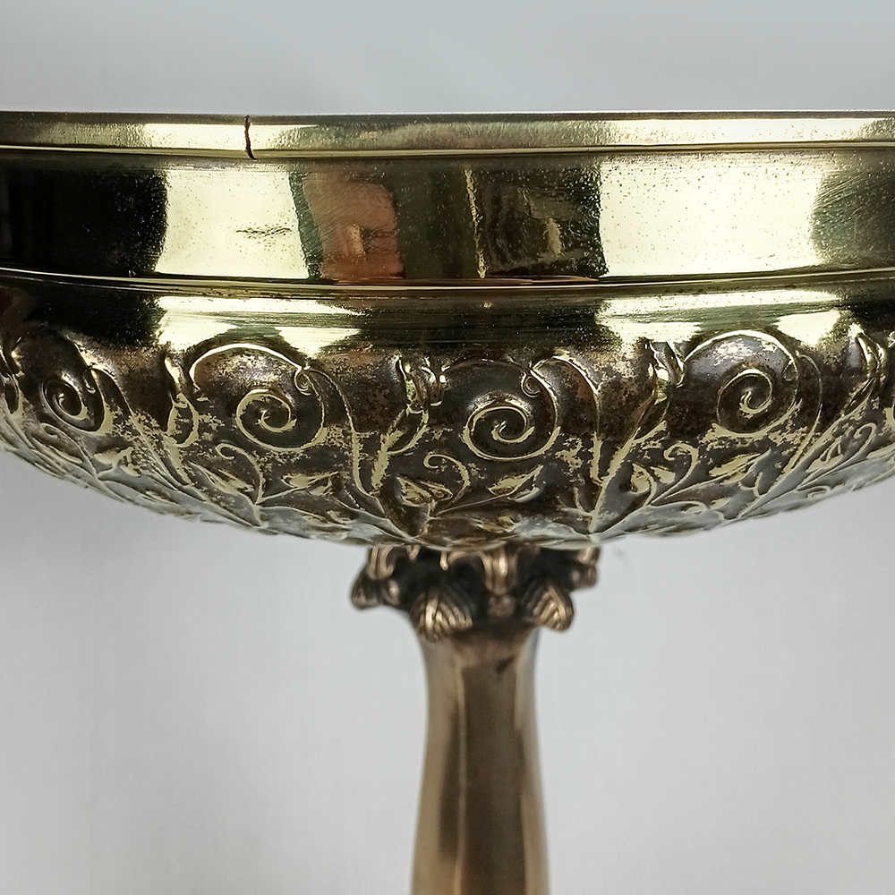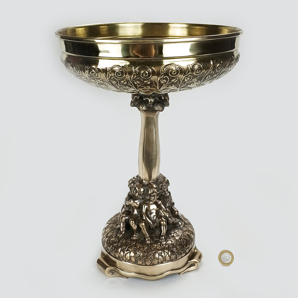 Belo e grande centro de mesa ou fruteira, feita de bronze. É ricamente decorada com escultura de crianças na base, e é assinada: K. Schwarz. Não conseguimos informações sobre o artista. Peça de provável origem austríaca ou alemã. Do início do século passado, está em ótimo estado de conservação, ideal para uso e decoração.