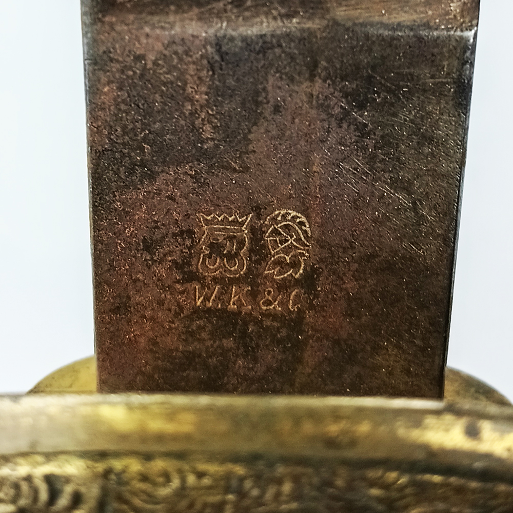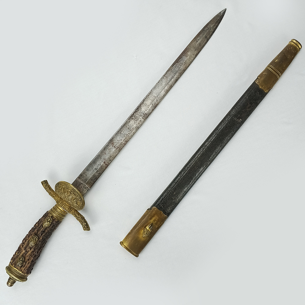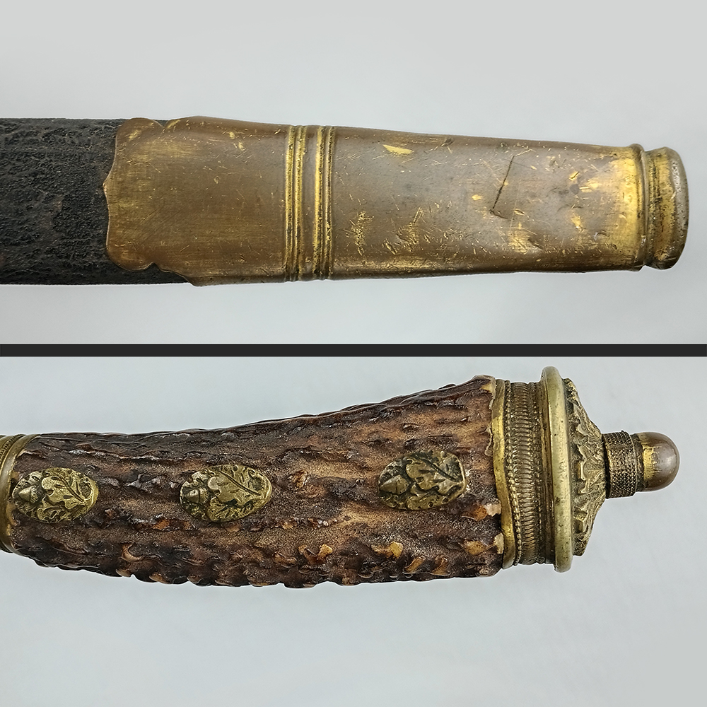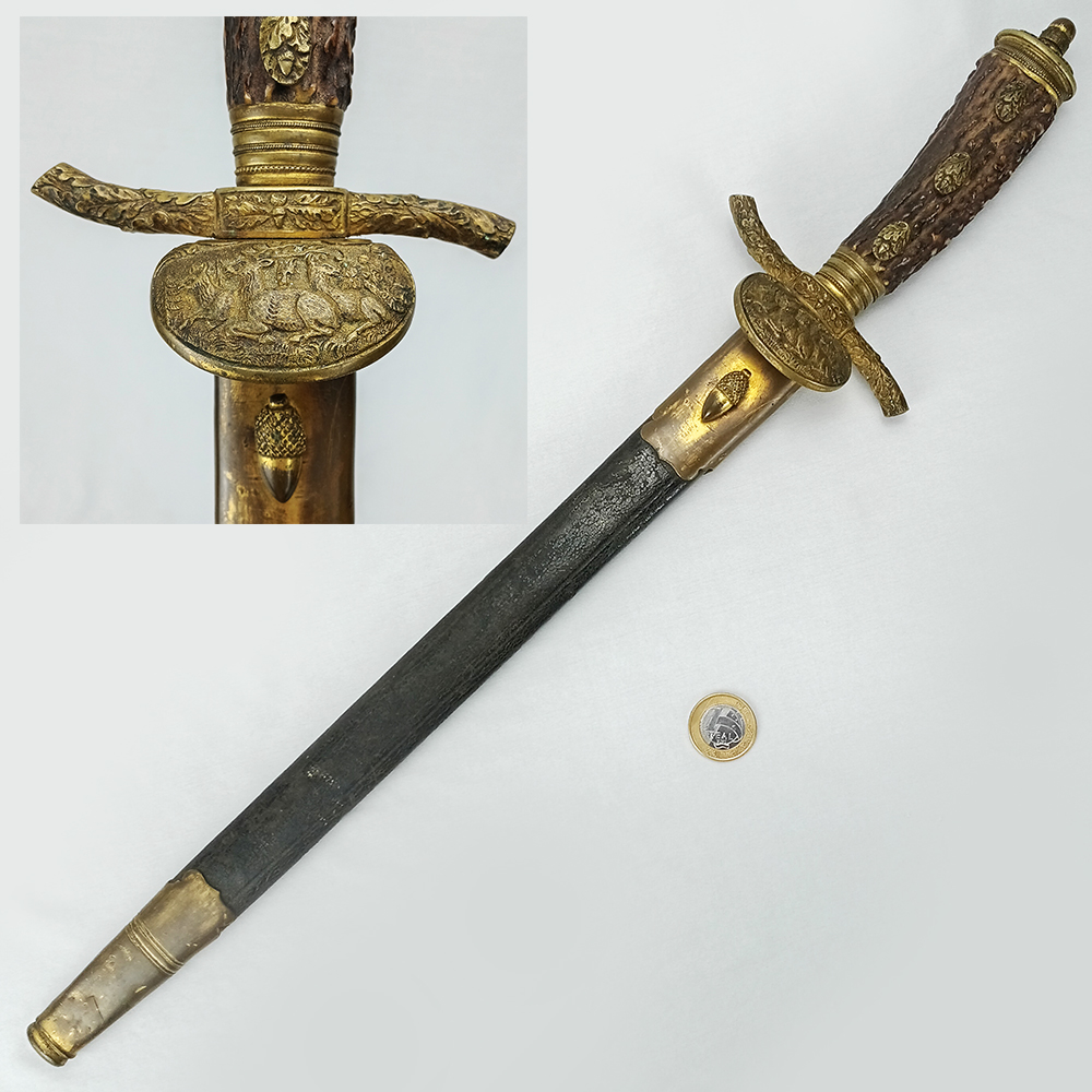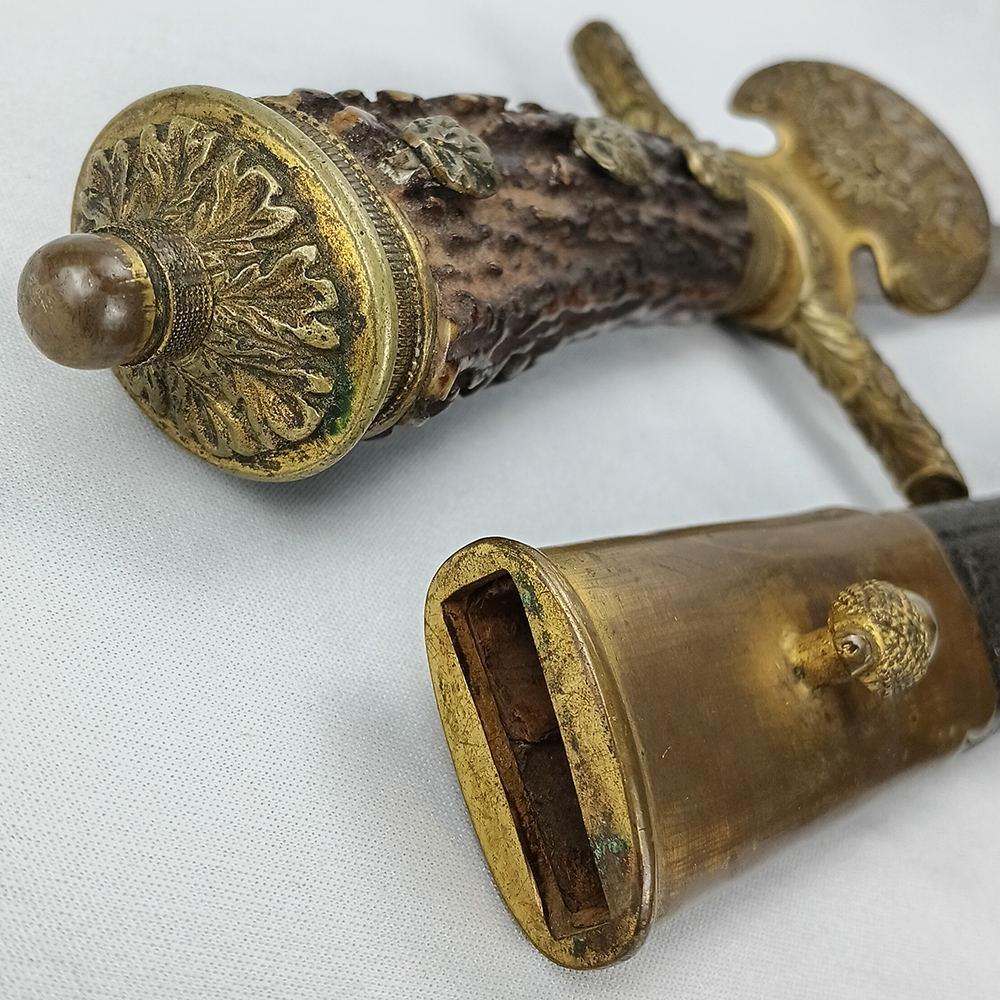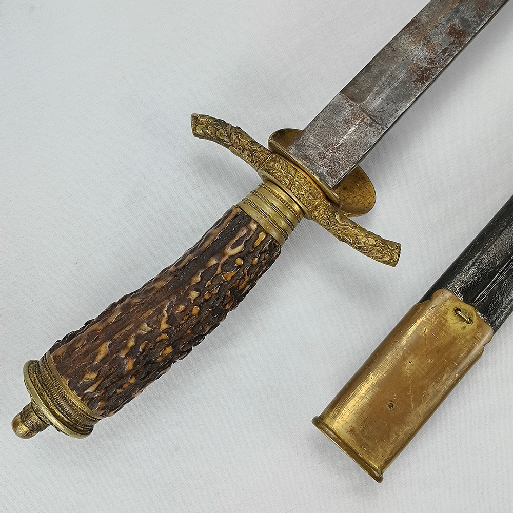 Belíssima faca de caça antiga, de origem alemã da fabricante WK & Co – Weyersberg Kirschbaum & Company. É ricamente decorada em bronze com resquícios de banho de ouro, e detalhe em chifre no cabo. A lâmina possui 40 cm de comprimento e é feita de aço carbono de alta qualidade, ficando protegida por uma bainha em bronze e couro. Do final do século XIX (1880/1890), está em ótimo estado de conservação, ideal para colecionadores e apreciadores.