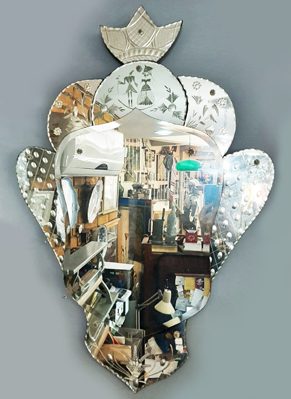Belíssimo espelho veneziano antigo, feito de cristal. A peça central é em cristal bisotê, e é ladeada por partes ricamente lapidadas e facetadas com desenhos geométricos, além de flores e pássaros. No topo do conjunto, o espelho central mostra um casal, provavelmente do Carnaval de Veneza, finamente lapidados e detalhados. Todos os espelhos possuem pequenas flores que prendem os mesmos ao suporte atrás, que é novo. Da primeira metade do século passado, está em bom estado de conservação, apresentando algumas marcas do tempo, mas que não interferem na beleza da peça. Perfeito para decoração de ambientes e uso.